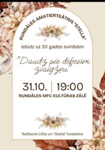 Rundāles multifunkcionālā centra kultūras zālē 31. oktobrī plkst. 19 Rundāles amatierteātra «Stella» 30 gadu jubilejas svinības «Daudz pie debesīm zvaigžņu».
