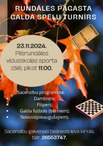 Pilsrundāles vidusskolas sporta zālē 23. novembrī plkst. 11 Rundāles pagasta galda spēļu turnīrs.