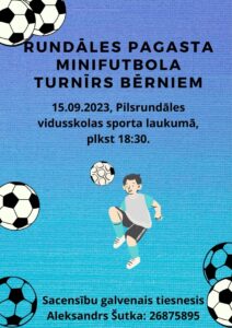 Pilsrundāles vidusskolas sporta laukumā 15. septembrī plkst. 18.30 Rundāles pagasta minifutbola turnīrs bērniem.