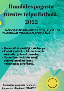 Pilsrundāles vidusskolas sporta zālē sestdien, 26. martā, plkst. 11 Rundāles pagasta turnīrs telpu futbolā.