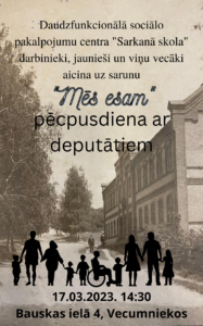 Vecumniekos, daudzfunkcionālajā sociālo pakalpojumu centrā «Sarkanā skola», 17. martā plkst. 14.30 sarunu pēcpusdiena ar deputātiem «Mēs esam».