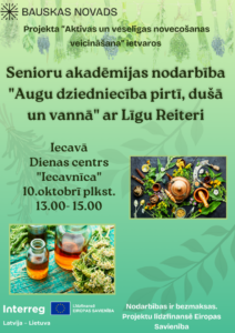 Iecavā, dienas centrā «Iecavnīca», 10. oktobrī plkst. 13 senioru akadēmijas nodarbība «Augu dziedniecība pirtī, dušā un vannā» ar Līgu Reiteri.