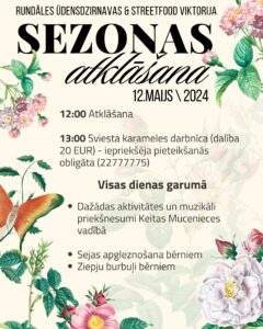 plkst. 12 atklāšana, plkst. 13 – sviesta karameles darbnīca; visas dienas garumā dažādas aktivitātes un muzikāli priekšnesumu Keitas Mucenieces vadībā; sejas apgleznošana un ziepju burbuļi bērnniem.
