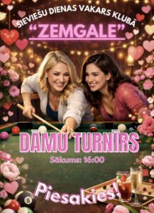 Biljarda un novusa klubā «Zemgale» 8. martā no plkst. 16 līdz 19 sieviešu dienas tusiņ-turnīrs kustībā un ar azartu – mājīga atmosfēra, svētku noskaņa, nelielas uzkodas un dzērieni, kā arī iespēja izmēģināt spēkus pie biljarda un novusa galdiem.