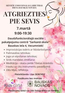 Daudzfunkcionālajā sociālo pakalpojumu centrā «Sarkanā skola» Vecumniekos, Bauskas ielā 4, 7. martā sieviešu emocionālās labbūtības diena «Atgriezties pie sevis» – pasākums Bauskas novadā dzīvojošām dāmām: