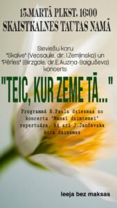 Skaistkalnes tautas namā 15. martā plkst. 16 sieviešu koru «Skalve» (Vecsaule) un «Pērles» (Birzgale) koncerts «Teic, kur zeme tā…».
