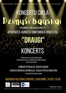 Bauskas kultūras centrā 8. oktobrī plkst. 15 Vecumnieku mūzikas un mākslas skolas un Baldones kultūras centra apvienotā jauniešu simfoniskā orķestra «Draugi» koncerts.