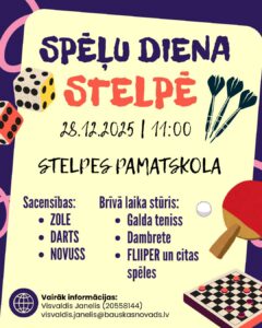 Stelpes pamatskolā 28.decembrī plkst. 11 spēļu diena: zolīte, darts, novuss, galda teniss, dambrete, «Fliiper» un citas spēles.