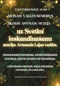 Aktieru Amtmaņu muzejā 7. decembrī plkst. 13 svētku ieskandināšana Valles senioriem mūziķa Armanda Lejas vadībā.