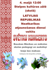 Stelpes kultūras zālē 4. maijā plkst. 12 svētku koncerts, veltīts LR Neatkarības atjaunošanas dienai. Piedalās Bauskas mūzikas un mākslas skolas pedagogi un audzēkņi.