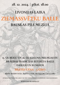 Bauskas pils muzejā 28. decembrī plkst. 18 tradicionālā Livonijas laika Ziemassvētku balle. Sarīkojums tiks ieturēts 15. gadsimta beigu un 16. gadsimta sākuma Melngalvju brālības Ziemassvētku tradīcijā.