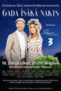 Jelgavā, brīvdabas koncertzālē «Mītava», pasta salā, 18. jūnijā plkst. 20, koncerts «Gada īsākā nakts» / TV3 Jāņu ieskandināšana.