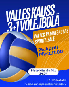 Valles pamatskolas sporta zālē 25. aprīlī plkst. 11 Valles kauss 3+1 volejbolā.