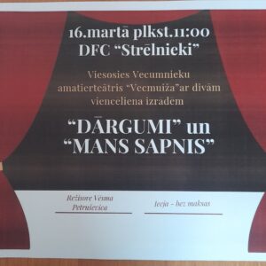 Daudzfunkcionālajā centrā «Strēlnieki» 16. martā plkst. 11 Vecumnieku amatierteātris «Vecmuiža» ar divām viencēliena izrādēm «Dārgumi» un «Mans sapnis».