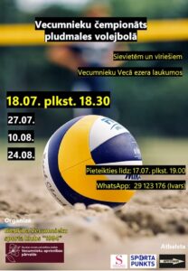 Vecumnieku vecā ezera laukumos 24. augustā plkst. 18.30 čempionāts pludmales volejbolā.