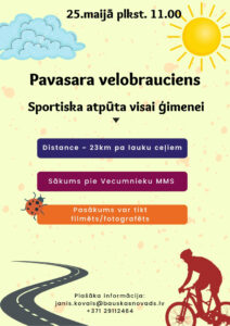 Vecumnieku pavasara velobrauciens 25. maijā plkst. 11. Sākums pie Vecumnieku mūzikas un mākslas skolas.