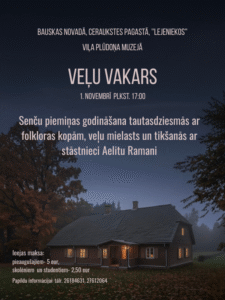 Viļa Plūdoņa muzejā «Lejenieki» 1. novembrī plkst. 17 Veļu vakars kopā ar stāstnieci Aelitu Ramani – veļu laika stāsti, dziesmu kamolu ritināšana kopā ar folkloras kopas dalībniekiem.