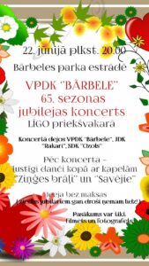 Bārbeles parka estrādē 22. jūnijā plkst. 20 VPDK «Bārbele» 65. sezonas jubilejas koncerts.