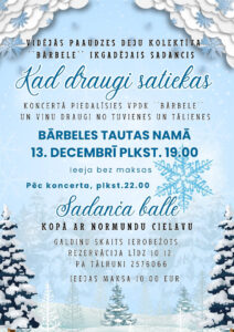 Bārbeles tautas namā 13. decembrī plkst. 19 VPDK «Bārbele» ikgadējais sadancis «Kad satiekas draugi», plkst. 21 sadanča balle kopā ar Normundu Cielavu.
