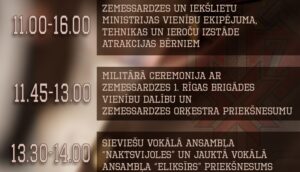 plkst. 11.45 – 13 militārā ceremonija ar Zemessardzes 1. Rīgas brigādes vienību dalību un Zemessardzes orķestra priekšnesumu;