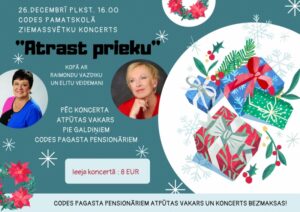 Codes pamatskolā26. decembrī plkst. 16 Ziemassvētku koncerts «Atrast prieku» kopā ar Raimondu Vazdiku un Elitu Veidemani.