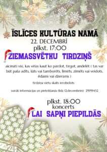 Īslīces kultūras namā 22. decembrī plkst. 17 Ziemassvētku tirdziņš; plkst. 18 – koncerts «Lai sapņi piepildās».