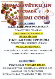 Codes pamatskolā 26. decembrī plkst. 11 Ziemassvētku pasākums Codes pagasta pirmsskolas vecuma bērniem;