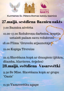 28. maijā – Vasarsvētki: plkst. 9.30 Sv. Mise, slavēšana kopā ar grupu «Oasis», plkst. 11.30 Vasarsvētku agape.