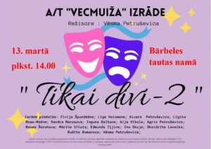 Bārbeles tautas namā 13. martā plkst. 14 amatierteātra «Vecmuiža» iestudējums «Tikai divi». Režisore Vēsma Petruševica.