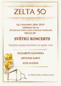 Īslīces kultūras namā 4. novembrī plkst. 18 kultūras nama jubilejas pasākums «Zelta 50» un svētku koncerts. Piedalās amatierkolektīvi un īpašie viesi Elizabete Zagorska, Artjoms Sarvi, Atis Auzāns.