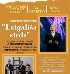 Grenctāles kultūras namā 5. martā plkst. 15 koncertprogramma «Latgalīša sirds». Latgales mūzikas dvēsele Juris Ostrovskis kopā ar pavadošo mūziķu grupu «ARmaestro» Anatolija Livčas vadībā.