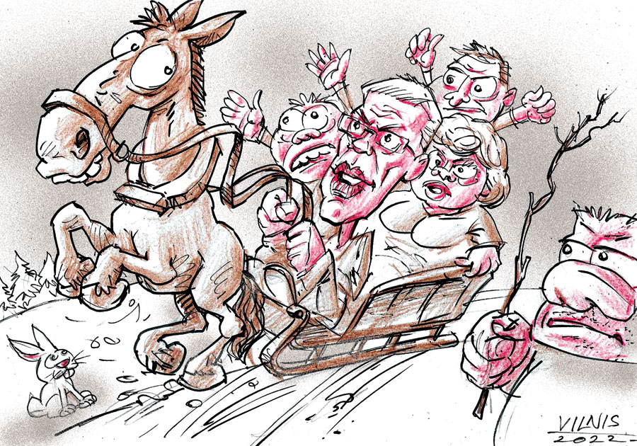 Ziemassvētki tuvu jau,/Valdības kā nav, tā nav./ Jāšaubās – no īstā gala/ Politiķi visu dara?/ Grāvī stūrē drošo bariņš./ Grožus beidzot saņem Kariņš,/ Sarunas uz riņķi griež,/ Strīdu punktus malā sviež./ It kā tāda panaceja –/ Būšot jauna ministrija,/ Gudrīšu uz visām vietām/ Pietikšot atliku likām./ Miķelis te pārstāv tautu,/ Satversme ja viņam ļautu,/ Žagariņus lietā liktu,/ Līdz pie prāta gaismas tiktu.