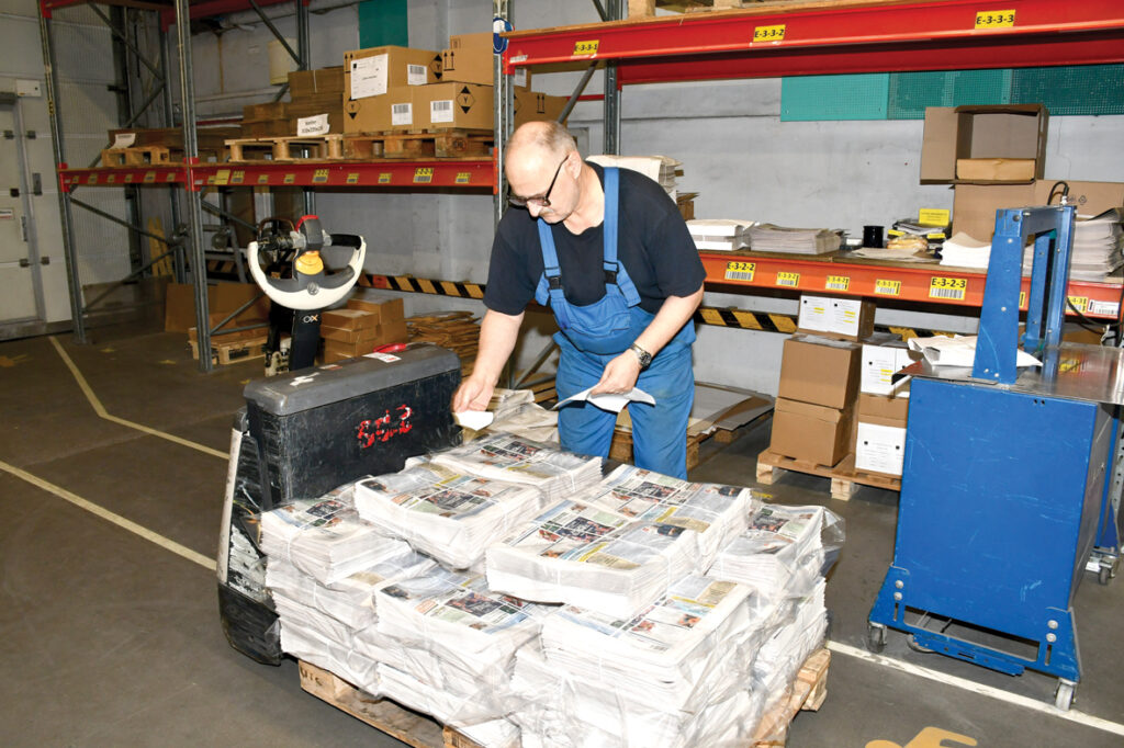 «Bauskas Dzīve» teju gatava ceļam mājup – loģistikas darbinieks Normunds Martuženovs veic pēdējos darbiņus avīzes tālākai nodošanai.