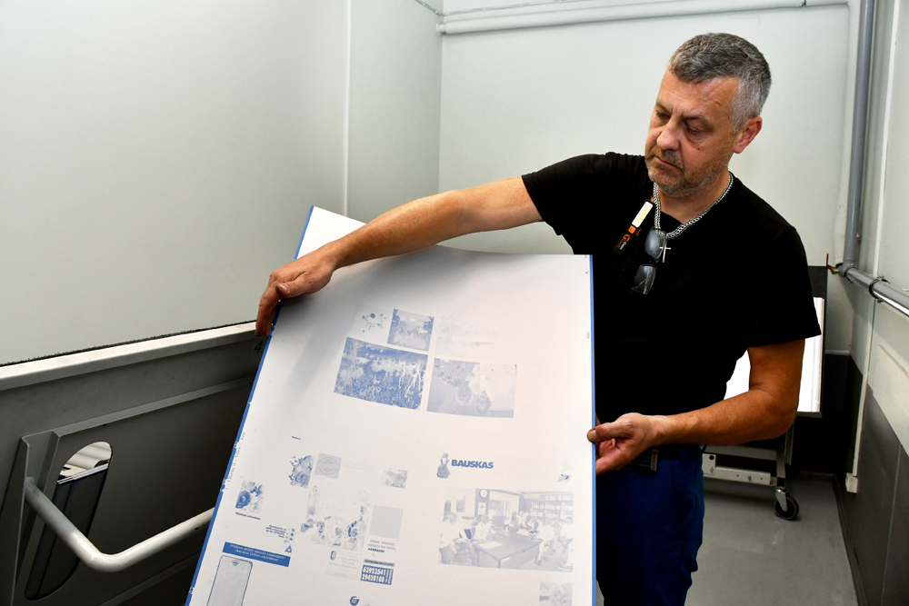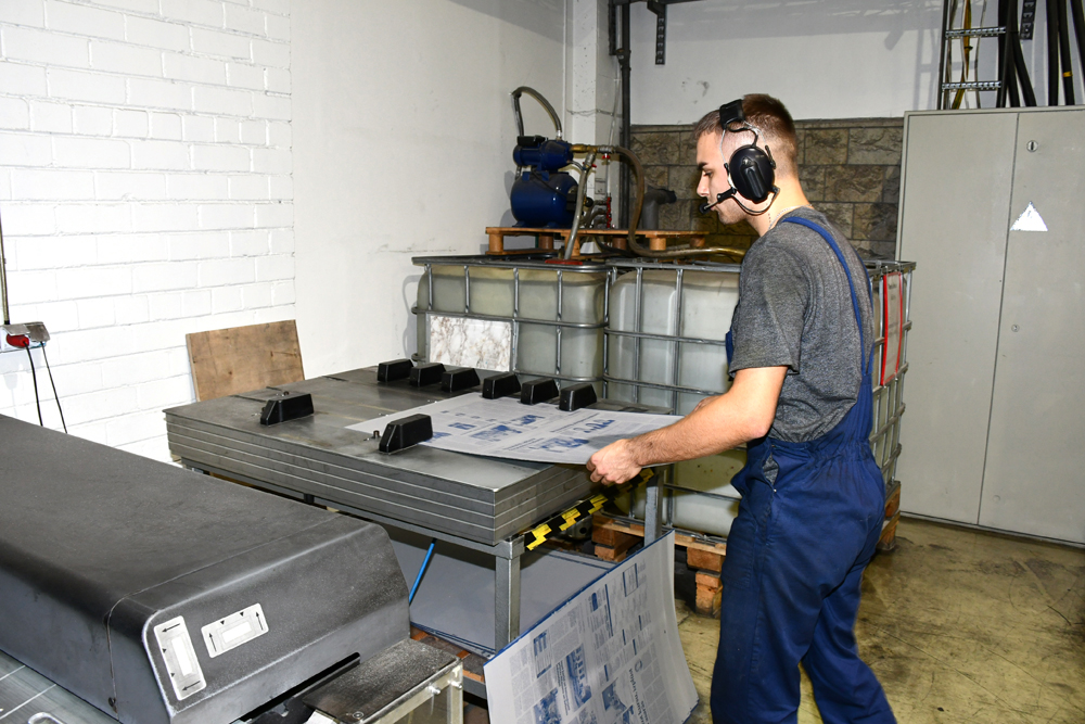 Lai iespiedplates ērtāk ievietotu drukas iekārtā, operators Martins Zagorskis tās iepriekš sagatavo. Foto – Ivars Bogdanovs