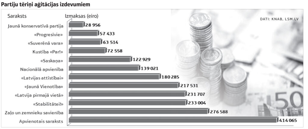 63 531,74 eiro. KNAB vēsta, ka visas politiskās organizācijas ir ievērojušas limitu. Noteiktajā apjomā ir reklāma pilsētvidē, sociālajos tīklos un citviet internetā, elektroniskajos plašsaziņas līdzekļos, kā arī labdarībai un sponsorēšanai. Limits neietver izdevumus par reklāmas izgatavošanu vai kampaņas plānošanu.