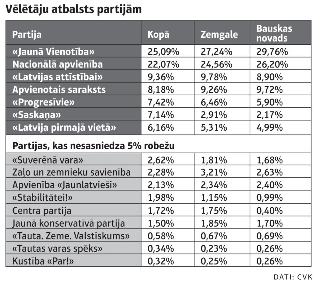 No Latvijas Eiropas Parlamentā (EP) ievēlēti deviņi deputāti no septiņām partijām, liecina Centrālās vēlēšanu komisijas (CVK) 17. jūnijā oficiāli apstiprinātie vēlēšanu rezultāti. Vislielāko vēlētāju atbalstu – 25,09% – saņēmusi «Jaunā Vienotība» (JV), kuru pārstāvēs divi deputāti. Mandāti deleģēti pieredzējušajiem Valdim Dombrovskim un Sandrai Kalnietei. Tā kā V. Dombrovski atkārtoti virzīs eirokomisāra amatam, viņa vietu ieņems EP jau strādājošā Inese Vaidere. Visvairāk mīnusu sarakstā saņēmuši Krišjānis Kariņš un Jānis Reirs, ar kuru darbību valdībā balsotāji acīmredzami nav apmierināti.