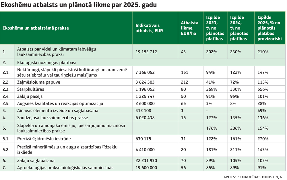 Ministrijas dati liecina – iepriekšējos divos gados ir novērota pieaugoša interese par dalību gandrīz visās ekoshēmās un atbalstāmajā praksē gan no lielāku, gan mazāku saimniecību puses. Īpaši tas aktivizējies pēc nosacījumu vienkāršošanas, samazinot administratīvo slogu un precizējot prasības. 2024. gadā atsevišķās ekoshēmās deklarētā platība ir ievērojami – divas un pat trīs reizes – pārsniegusi plānoto. Lielākais 3,3 reižu pārsniegums vērojams starpkultūru atbalstam. Savukārt pērn, kā liecina provizoriskie dati, tas būs pat 5,5 reizes lielāks nekā plānots.