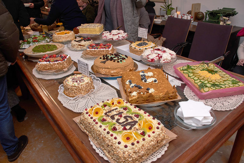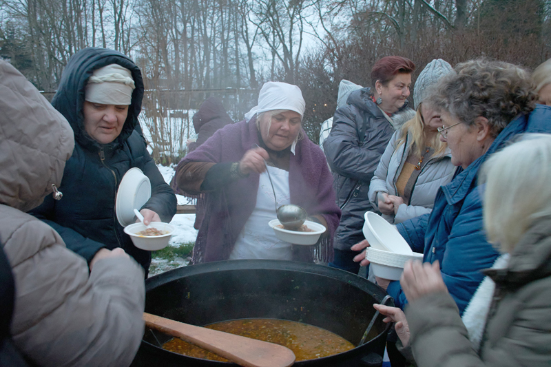 Notika mielošanās pie ugunskura zupas katla ārā, pirmajā stāvā varēja cienāties ar īsto latvju saimnieču spēcīgajiem ēdieniem un našķoties ar 25 dažādām kūkām. To vidū bija viešņu atvestās un vietējo ceptās, arī zorģenieces Ritas Rasnes torte pēc populārās Kaucmindes receptes parauga, kuru zina arī jaunieši.