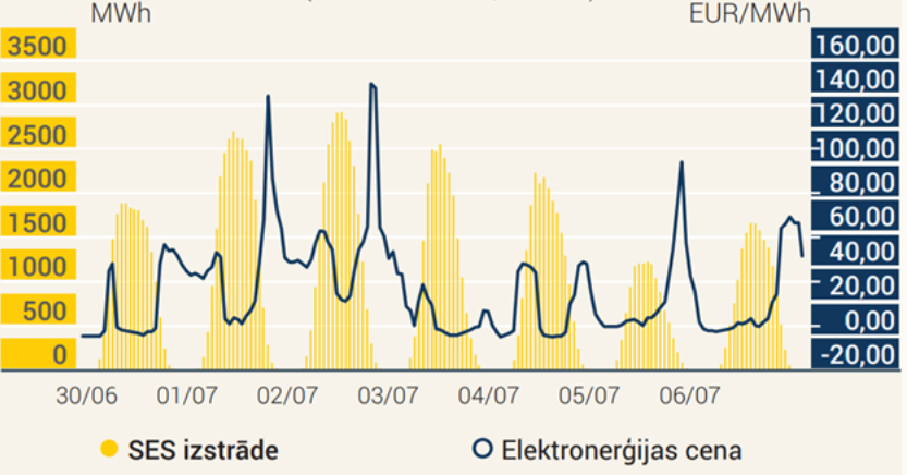 Tas palīdzēja samazināt elektrības cenu, īpaši dienas stundās, jo tirgū nonāca vairāk lētas elektroenerģijas. «Kā piemēru var minēt 2025. gada 27. nedēļu jūlija sākumā, kad novērota visaugstākā saules izstrāde Baltijā 149 GWh apjomā, un tas nosedza 34% no nedēļā patērētās elektroenerģijas. Savukārt vidējā elektroenerģijas cena bija 26 EUR/MWh, viena no zemākajām gadā. Redzams, ka laikā, kad SES izstrāde ir augstāka, cena ir zemāka,» skaidro I. Bidere. ◆