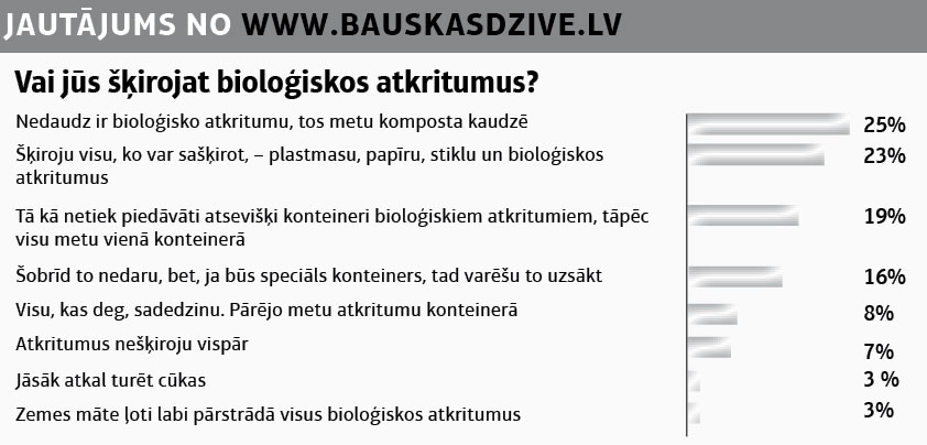 rināšanas, tur varot piekrist, taču sistēmai pašvaldībā jābūt, saistošajiem noteikumiem jābūt un iedzīvotāju informēšanai un izglītošanai jābūt. Likums nekādas atkāpes neparedz. Turklāt tiek akcentēts, ka laiks, kad iedzīvotāji pēc savas gribas paši vērsīsies un pieteiksies bioloģisko atkritumu šķirošanai, vai viņi to grib vai negrib, esot beidzies, tagad jau ar 1. janvāri to visiem kā obligātu nosaka likums.