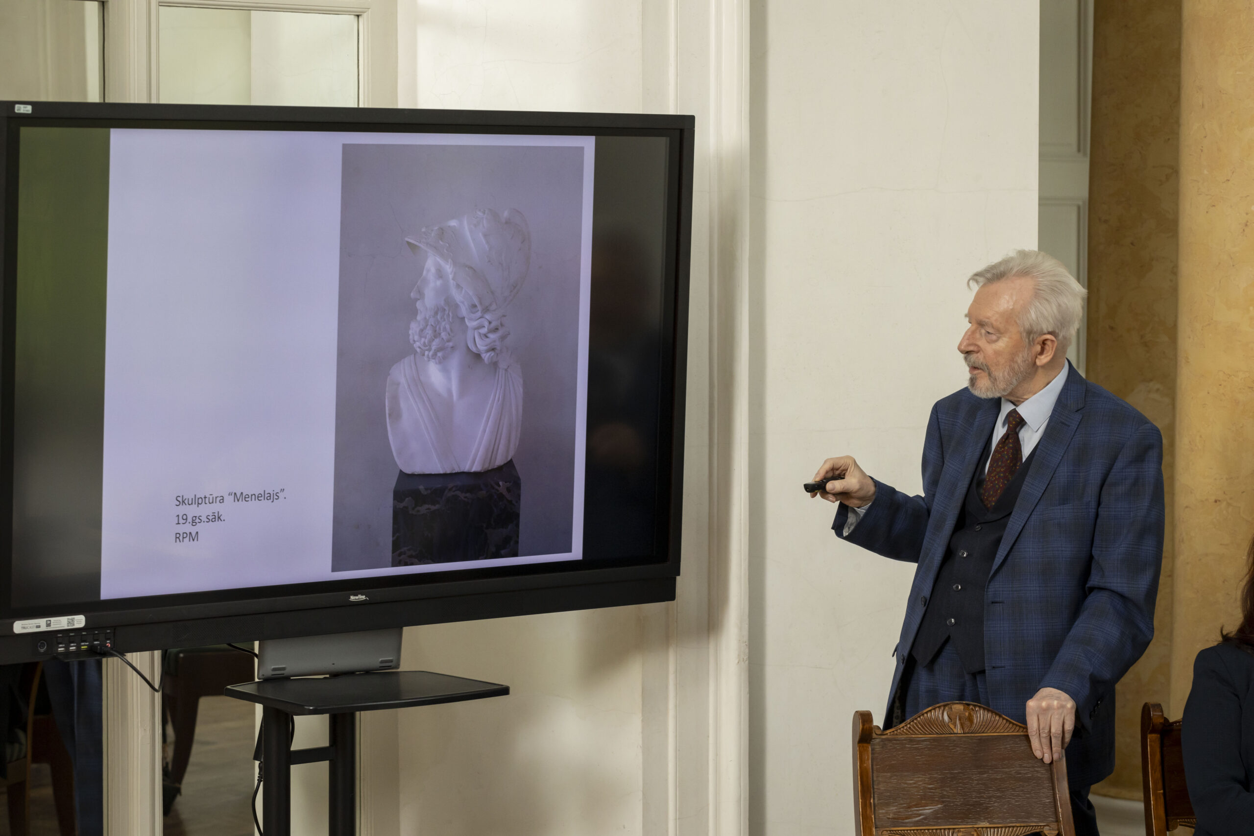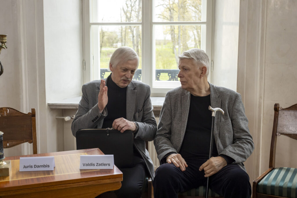 Mākslinieks, mākslas zinātnieks un ilggadējs Rundāles pils muzeja direktors Imants Lancmanis klātesošos iepazīstināja ar prezentāciju, kurā atklāja gan Mežotnes pils izcelsmi, gan uzskaitīja tās eksponātus, kas pašlaik atrodas Rundāles pilī. «Kultūratbildība ir galvenais iemesls, uz kā pamata šī pils ir jāglābj,» uzsvēra Imants Lancmanis. Foto: Didzis Grodzs