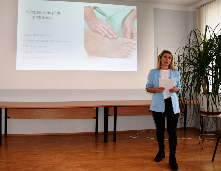 Speciāliste savu stāstījumu par pēdu aprūpi papildināja ar slaidiem prezentācijā. Tika nosauktas problēmas, kādas bieži vien ir senioru pēdām, iztirzāts, kā tās pareizi aprūpēt. Izplatīta ir sausa un plāna pēdu āda, uzstaigājumi, sabiezējumi un varžacis, pēdu ādas plaisas, pēdu deformācija un pēdu un apakšstilbu tūska, kā arī sabiezēti un deformēti nagi. «Sausu pēdu ādu veicina nepietiekama ūdens dzeršana, ar kafiju vien nepietiek! Šādu plānu ādu ar cauri spīdošiem asinsvadiem nedrīkst berzt, lai neveidotu brūces, kas savukārt var novest pie infekcijas,» uzsvēra D. Jemeļjanova.