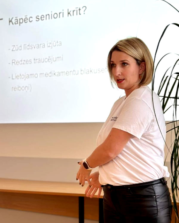 Fizioterapeite Irina Pašišņaka akcentēja drošības tēmu, proti, kā sevi sargāt uz slidenām ietvēm, kā arī mājās. «Sniegs ielās un uz ietvēm, kā arī apledojums pierāda mūsu lekciju nepieciešamību,» sacīja speciāliste, atzīstot gan, ka tomēr visbiežāk seniori traumas gūst mājās, tāpēc jāizvērtē, cik droša vide ir dzīvojamajā istabā, virtuvē un vannas istabā. Veci cilvēki bieži vien krīt tāpēc, ka ar laiku zūd līdzsvara sajūta, veidojas redzes traucējumi, un cilvēki bieži vien nepamana, ka «izkrīt» kāds redzes lauks, tālab ik pa laikam būtu derīgi pārbaudīt, vai, piemēram, abas rokas redzam vienādi, it sevišķi situācijā, ja ir bijis mikroinsults, skaidro fizioterapeite. Nereti problēmas rodas, lietojot medikamentus, kuri izraisa blakusparādības, piemēram, galvas reiboni, par to ir jāsaka ārstam, nav jādzīvo «ar dullu galvu».