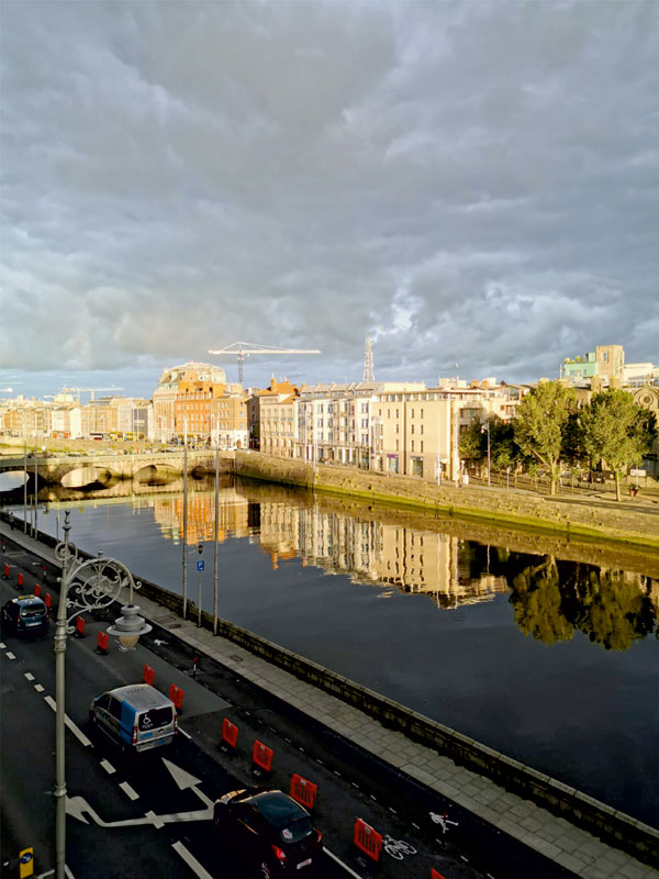 Skats uz upi un pilsētas domes ēku no Inas dzīvokļa loga Dublinā.