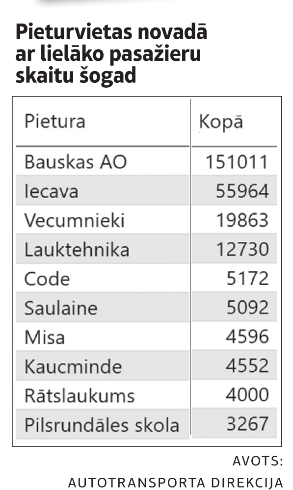 Direkcijas mājaslapā redzams, kāda ir pasažieru plūsma Bauskas novada sabiedriskā transporta pieturās pēdējos pāris gados. Bez Bauskas, Iecavas un Vecumniekiem, visvairāk pasažieru šogad iekāpuši un izkāpuši pieturās «Lauktehnika», «Code», «Saulaine», «Misa», «Kaucminde». Savukārt ir pieturas, kur autobusu nav gaidījis neviens, tāpat ir desmitiem tādu, kur uzņemti mazāk nekā 10 pasažieri. «Strēlniekos», kurp devās «Bauskas Dzīve», šogad bijis nedaudz vairāk kā 900 pasažieru.