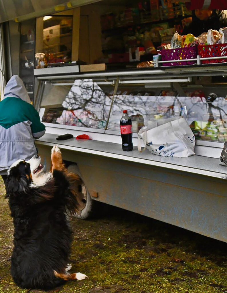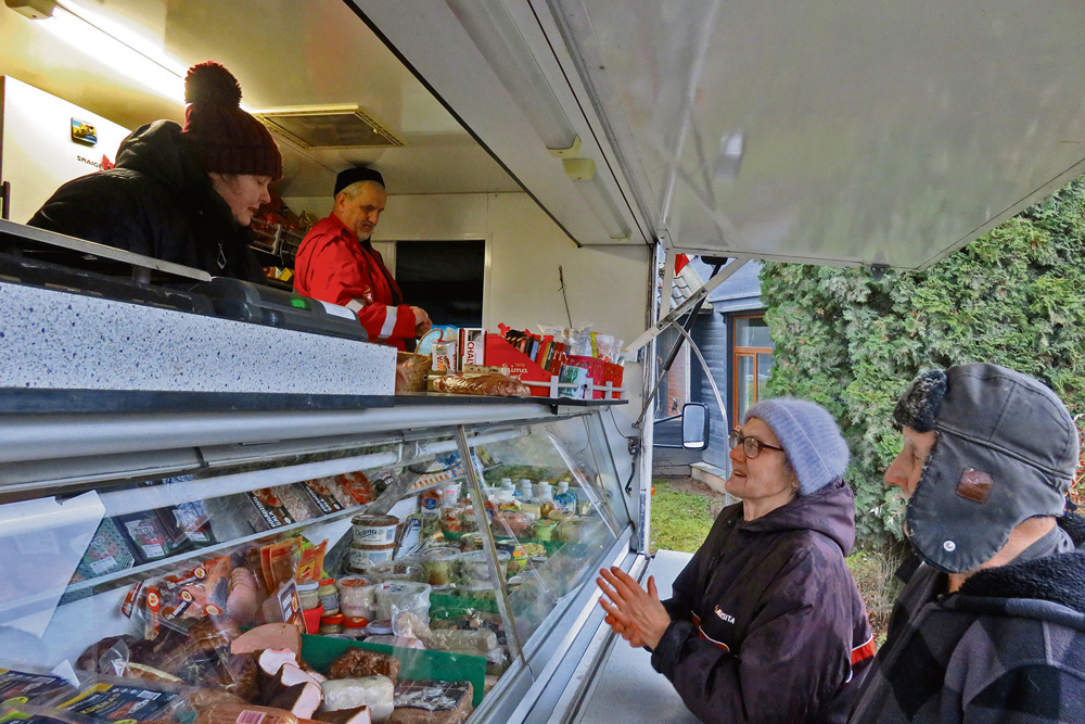 Inešu pagasta «Gala Bitēnos» pie autoveikala sastopu trīs pircējus – 89 gadus veco Gunti Liepiņu ar kundzi un suni Džennu, kas, uz pakaļkājām nostājies, iemācījies no veikalniekiem izlūgties cepumus. G. Liepiņš iegādājas lielo «Coca-Cola» pudeli, kafiju, rupjmaizi, baltmaizi, pīrādziņus, galertu. Pēc tam kārta pienāk kundzei, kura preces sarakstījusi uz lapiņas: maltā gaļa, galda desa, biezpiens, krējums, kefīrs, sutināti kāposti, cepumi, konfektes, dzeramā soda, rozīnes, kakao, kafija, sausā kaķu barība, papīra dvielīši. Pensijas abiem pircējiem ap 400 eiro. Iepērkoties reizi nedēļā. Tuvākais veikals viņiem ir piecu kilometru attālumā Inešos. Varētu jau kaimiņiem palūgt, lai aizved uz veikalu, bet neesot vajadzības. Tāpat regulāri braucot ciemos bērni un mazbērni. Tomāti, gurķi, sīpoli izaugot savā dārzā, neesot kur likt.