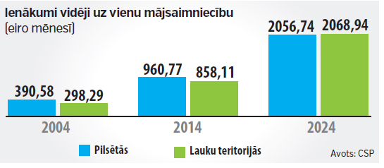 Ienākumu kāpums bijis krietni straujāks. No 2004. līdz 2014. gadam vidējie mēneša ienākumi vienai mājsaimniecībai trīskāršojušies, bet no 2014. līdz 2024. gadam tie dubultojušies. Pirms 10 vai 20 gadiem augstāki vidējie ienākumi bija pilsētā, bet 2024. gadā laucinieki pārspēja pilsētniekus.