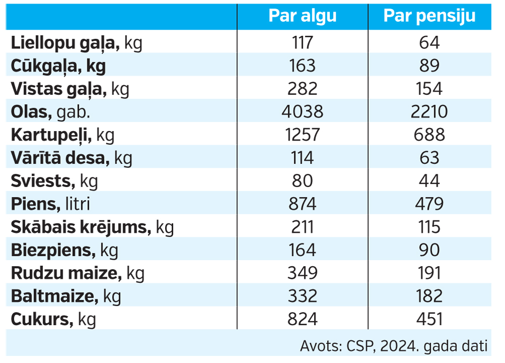 Lai gan par vidējo pensiju var nopirkt gandrīz divreiz mazāk pārtikas nekā par algu, tomēr pensionāru pirktspēja augusi straujāk. Par vidējo pensiju 2024. gadā varēja iegādāties 2210 olas, salīdzinot ar 1902 olām 2014. gadā, vai 63 kg vārītās desas pret 40 kg pirms desmit gadiem, vai 479 litrus piena, salīdzinot ar 299 litriem 2014. gadā.