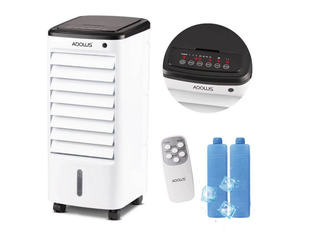 Piemēram aplūkosim vienu modeli – Adolus Frosty Flow. Ierīce pati par sevi ir salīdzinoši neliela. Bez iepakojuma tā sver mazāk kā 5 kg un tajā var ieliet 3,5 l ūdens vai ūdens un ledus maisījumu. Darbību var kontrolēt ar LCD ekrānu vai pulti. Ir iespējams iestatīt taimeri un ventilatoru (trīs ātrumi). Optimālākai darbībai dzesētājam var mainīt gaisa plūsmas virzienu, nosedzot visu istabas platību.
