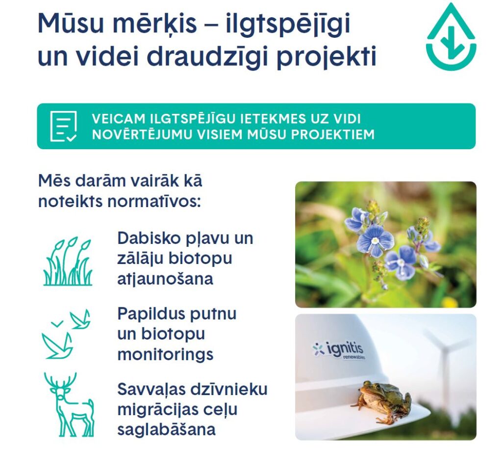 Sadarbojoties ar Latvijas Dabas fonda ekspertiem, Ignitis Renewables ir izstrādājis stratēģiju dabisko pļavu biotopu un zālāju atjaunošanai. Savu ieguldījumu ir devuši arī vides ainavu veidošanas profesionāļi, sniedzot ieteikumus par pasākumiem dabiskās ainavu vides saglabāšanā. Šī holistiskā pieeja uzsver Ignitis Renewables apņemšanos un rūpes par vides aizsardzību, vienlaikus attīstot atjaunojamās enerģijas ražošanas projektus.